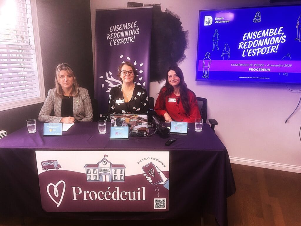 Sur la photo, dans l’ordre habituel: Dany Grenier, coordonnatrice aux communications à Saint-Jean-Eudes, Josée Masson, fondatrice et présidente-directrice générale de Deuil-Jeunesse et Niky Panayotopoulos, directrice de la Ligne d’intervention spécialisée chez Deuil Jeunesse